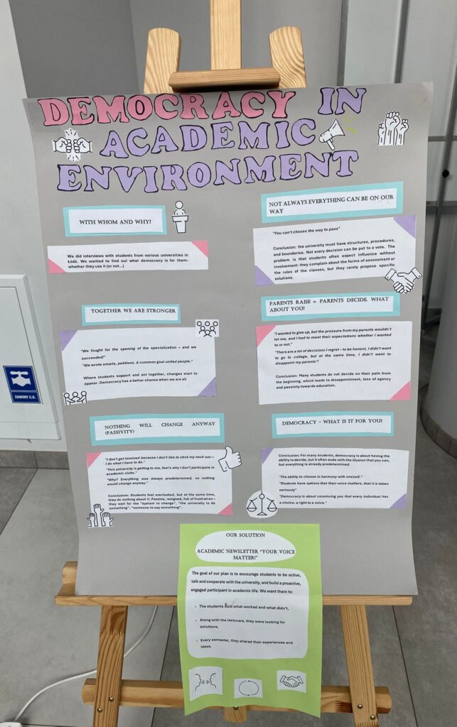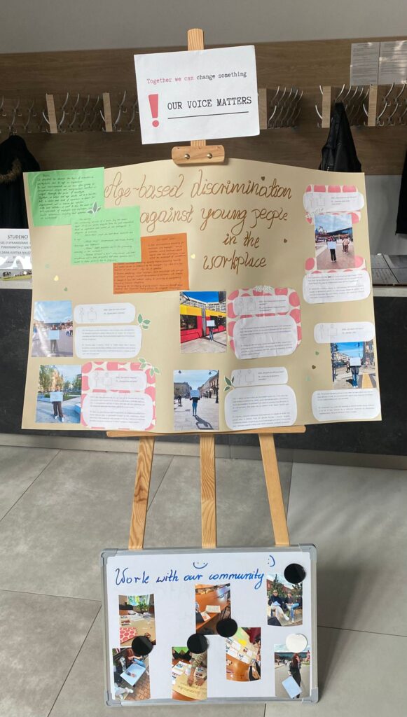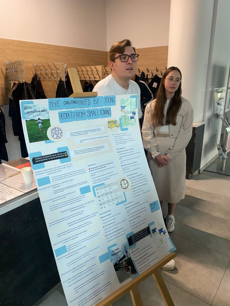 The student researchers addressed pressing community challenges that directly affect young people’s lives. Topics ranged from age-based workplace discrimination and educational pressures to the struggles faced by young artists and barriers experienced by early parents. Presentations included “What does democracy mean to me? Reconstructing the voice of the youth” and “Youth vs. Włocławek – Where Do We Belong?”